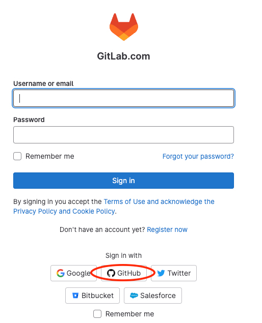 Caso não tenha um usuario no gitlab vc pode logar com a conta do github, basta clicar no botão