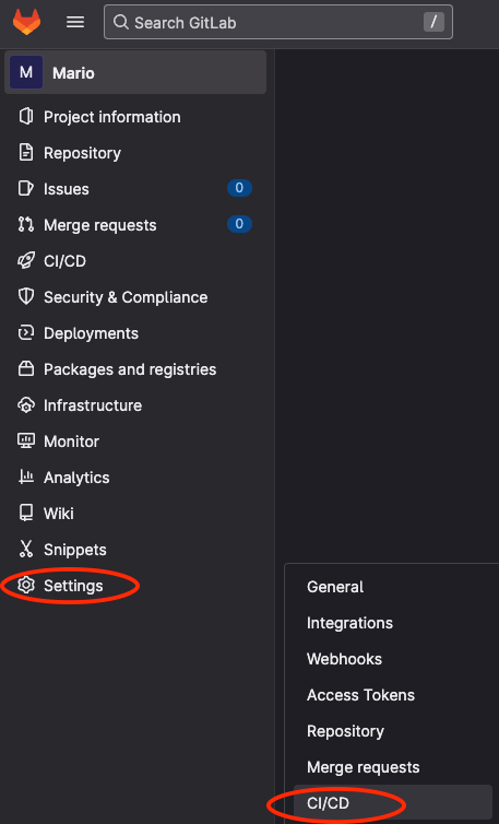 Precisamos copiar o token do repositorio então no gitlab no seu repositório Mario no menu lateral do projeto clique em: