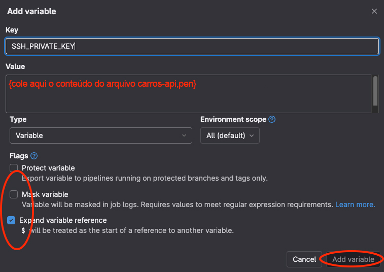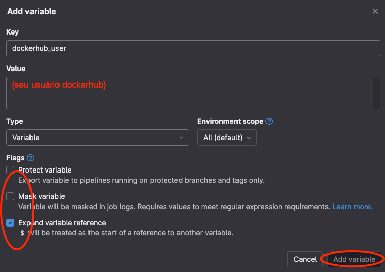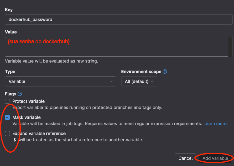 Preencha os dados conforme a imagem abaixo: e depois confirme em Add variable variavel: