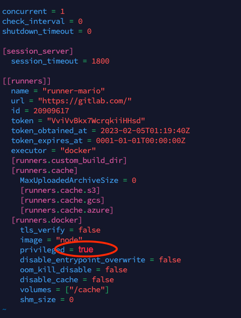 #Configuration (with the authentication token) as saved in "/etc/gitlab-runner/config.toml"