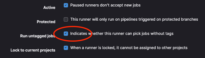 Certifique que em Assigned project runners tenha uma bolinha verde na frente do runner
